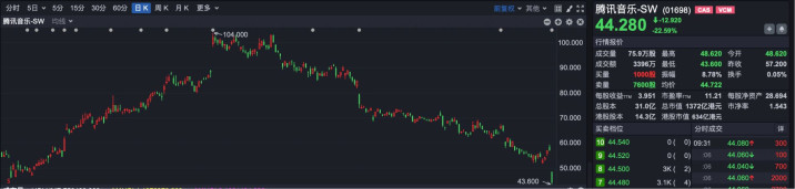 开盘之后,腾讯音乐港股跌幅飞速扩大到23%隔邻。前年8月13日,腾讯音乐港股一度创下104港元的历史新高,但7个月之后,其股价依然跌到最低43.6港元,阶段最大跌幅高达58%。