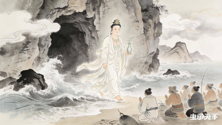 就在这时,潮音洞传来一阵高昂的钟声,一位身着素衣、手合手净瓶的女子稳重走来,恰是不雅音菩萨。