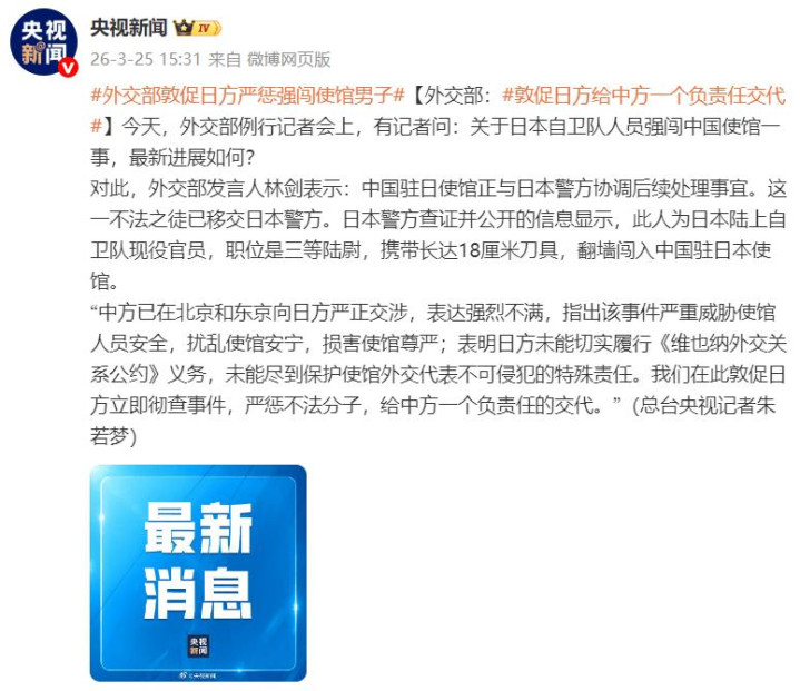 又名自称日本陆上自保队现役官员的须眉翻墙闯入中国驻日大使馆,手合手18厘米长延续刀具,公然扬言以“神的口头”刺杀中海应答东说念主员。