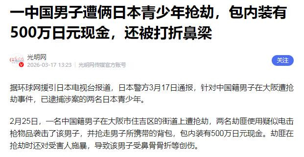 本年2月25日,又名中国公民在大阪街头遭不解东说念主员暴力迫切,随身佩戴的500万日元现款被掠夺,东说念主身安全受到严重危害。日本驻大阪总领事馆赶紧发布安全教唆,明确建议中国公民严慎赶赴。
