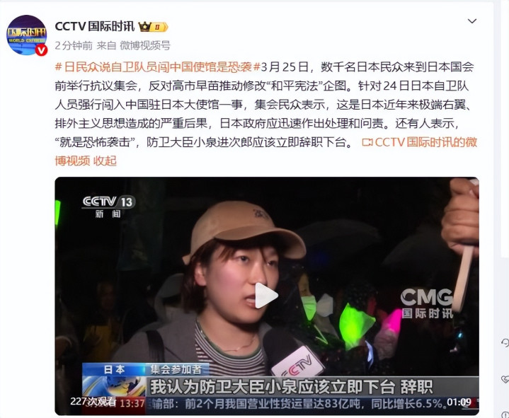还有人人明确指出,自保队东说念主员强闯中国使馆的步履,便是日本比年来顶点右翼、排外见识想想泛滥的严重效果,这不仅是对中国的寻衅,更是对日本和平的要挟,稳渊博臣小泉进次郎应立即去职下台。